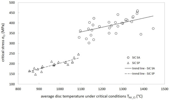 The same procedure was adopted for all SiC SA and SP test specimens, obtaining in this way two series of critical stress values σCi. The resulting failure stress data were used to obtain the estimation of the Weibull probability distribution parameters according to the ASTM standard practice [24]. Then, the stress limit σLIMIT was calculated for both SiC SA and SP, taking as a reference a survival probability equal to 99.99%. As a final step, these values were associated with a specific temperature range, considering the average minimum temperature and the average maximum temperature of the discs under critical conditions.