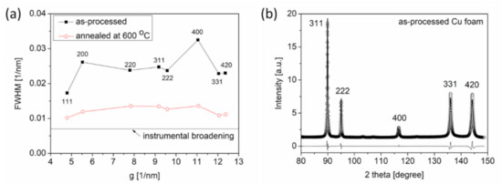 (a) Williamson–Hall plots for Cu foam processed by route C and the counterpart of this material, which was annealed at 600 °C for 5.5 h after dealloying. FWHM: full width at half maximum, g: magnitude of the diffraction vector (see text). (b) A section of the diffraction pattern evaluated by the CMWP fitting method using data obtained from a Cu foam processed by route C. The open circles represent the measured data, and the solid line reflects the fitted pattern. The difference between the data and the calculated pattern is shown as a black line at the bottom of the figure.