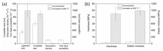 - The density of in-grown lattice defects, such as dislocations and twin faults, in the ligaments decreased significantly during annealing at 600 °C. Softening effects arising from the defect structures were overwhelmed by strengthening caused by the coalescence of the ligaments. Thus, heat treatments considerably improved the hardness and elastic modulus of materials.