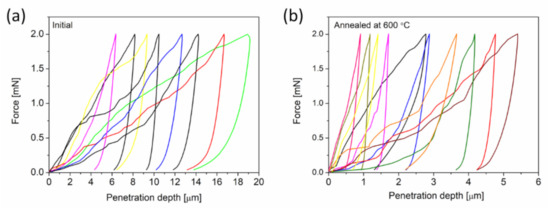 The influence of annealing on the mechanical behaviors of Cu foams processed by route C was investigated by using nanoindentation. Approximately 20 Vickers tests were conducted on each foam before and after annealing at 600 °C for 5.5 h. Representative force-penetration depth curves for the as-processed and heat-treated materials are shown in Figure 7a,b, respectively. High scattering of the load-depth curves suggests a heterogeneous microstructure both before and after annealing. The maximum penetration depth varied between 5 and 20 µm for as-processed materials, which corresponds to a Vickers indentation diagonal of 35–140 µm. For the annealed sample, the indentation diagonals range from 7 to 35 µm. While these indentation sizes are much larger than the corresponding ligament sizes (which are 0.5 and 1.6 µm before and after annealing, respectively), the indentation results are nonetheless scattered. The pronounced spatial variation of the indentation behavior most likely arises from the hierarchical pore structures that form due to the relatively long pack cementation time (15 h) of route C. This means that micropores with an average size of approximately 6 μm coexist with the nanopores, which was caused by the multiphase structure of the pack cemented material (i.e., Al phase also forms beside Al2Cu) [18]. Such large pores can promote softer behavior for some indentations during indentation measurements, which manifests as a higher penetration depth. Moreover, there may be both lateral and in-depth variations in the bond strength between the ligaments, contributing to inhomogeneous indentation behaviors.