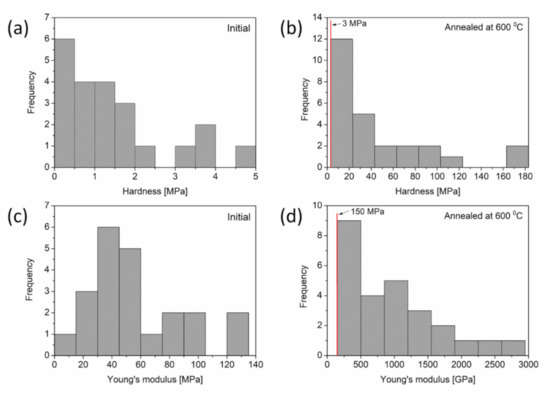 (a,b) Distributions of hardness and (c,d) Young’s modulus obtained by nanoindentation measurements conducted on Cu foams processed by (a,c) route C and (b,d) its counterpart annealed at 600 °C for 5.5 h after dealloying.