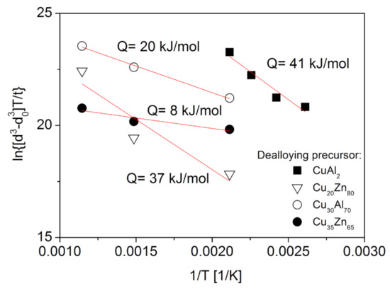 A plot of versus 1/T used to determine the activation energy of the mechanism behind ligament coarsening in Cu foams processed by dealloying and subsequently annealed under an inert atmosphere. The plotting was performed based on Equation (3). The grain sizes (d and d0) were taken in nanometres, while the units of t and T were hours and Kelvin degrees, respectively.
