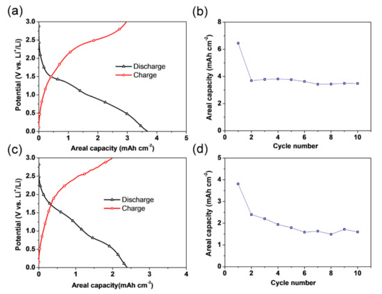 Figure 12 shows the electrochemical properties of CuO/Cu2O/Cu foam anodes at a current density of 1 mA/cm2 over 0.01–3 V, where the Cu foam and CuO/Cu2O oxidation layers act as a current collector and active materials, respectively. The typical voltage profiles for both anodes prepared at different oxidation temperatures of 170 °C and 200 °C are displayed in Figure 12a,c. The discharge and charge profile shapes of both CuO/Cu2O/Cu foam anodes are similar to those reported for other CuO or Cu2O anode materials [45,46]. Figure 12b,d show the cycle performance of the CuO/Cu2O/Cu foam anodes oxidized at 170 °C and 200 °C.