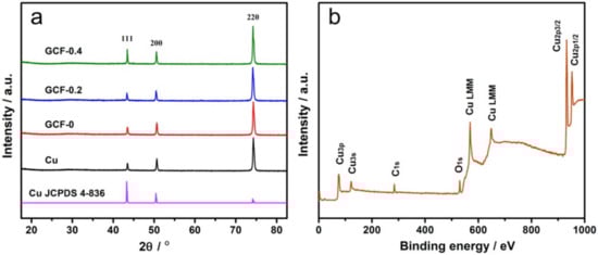 Figure 2a shows the XRD patterns of the above four samples. As can be seen from the figure, the diffraction peaks of the GCF samples were located at the same 2θ values as those of the pure copper sheet (JCPDS No.4-836), and there was no impurity peak. The grain size of each sample was approximately 30 nm. XPS analysis (Figure 2b) shows that sample GCF-0.2 was mainly composed of Cu, with Cu2p3/2 and Cu2p1/2 located at 932.7 and 952.6 eV, respectively, corresponding to Cu0 [27], which is consistent with Figure 2a. The weak O1s peak at 530.4 eV indicates that the sample contained a small amount of copper oxide, which may be caused by the oxidation of the surface of copper particles in the air.
