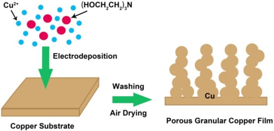Figure 1 indicates that the addition of triethanolamine to the CuSO4 solution significantly changed the morphology of the samples. The reason may be ascribed to the fact that triethanolamine molecules can coordinate with copper ions [28], and the large volume and steric effect of triethanolamine molecules would hinder the accumulation of copper ions during the electrodeposition process. Therefore, the electrodeposited metal copper forms a porous granular film structure (Figure 3). The concentration of triethanolamine has an effect on the size of copper particles. As the concentration increases, the particle size of copper particles decreases. However, when the concentration of triethanolamine is too high, the adhesion between the tiny particles of copper weakens, leading to the falling off of copper particles in large areas. According to the experimental results, the optimum additional amount of triethanolamine was 0.2% in weight.