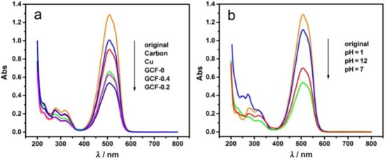 Carbon, Cu, GCF-0, GCF-0.2 and GCF-0.4 were used as cathodes, and the other conditions were the same as in Section 2.2 (similarly hereinafter). The UV–visible absorption spectra of MO before and after the reaction are shown in Figure 4a. When the cathode was carbon, Cu, GCF-0, GCF-0.2 or GCF-0.4, the decolorization ratio (DR) of MO was 21.4%, 29.2%, 48.3%, 57.9% or 51.1%, respectively. Evidently, the DR of MO with Cu and GCF cathodes was higher than that with the commonly used carbon electrode. The DR with GCF cathode was much higher than that with the Cu cathode, and the GCF-0.2 cathode exhibited the largest DR of MO.