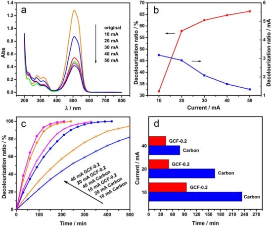 MO electrochemical oxidation experiments were carried out with GCF-0.2 cathode and the carbon cathode. The decolorization ratio-time curve under different current intensities is shown in Figure 6c. As can be seen, the DR of MO increased with the increasing current intensities and time; when the DR of MO reached 50%, the decolorization times required for carbon and GCF-0.2 cathodes are shown in Figure 6d. Compared with the commonly used carbon cathode, the decolorization rates of MO with GCF-0.2 cathode increased by approximately 59.4%, 70.9% and 44.6% when the degradation current intensities were 10, 20, and 40 mA. Figure 6c,d indicates that the current intensity had a significant influence on the electro-Fenton-like degradation of MO by GCF-0.2 cathode. The indirect oxidation at the cathode requires O2 (Equation (1)), which is mainly generated at the anode. When the current intensity was 10 mA, the O2 generated at the anode was less, and the efficiency of the GCF-0.2 cathode cannot be fully exerted. When the current intensity was 40 mA, although more O2 generated at the anode, the H2 generated at the cathode also increased, which prevents the diffusion of O2 to the cathode surface and is not conducive to the cathode reaction. When the current intensity was 20 mA, the effects of both sides can be well balanced. Thus, the GCF-0.2 cathode exhibited a better decolorization effect of MO.