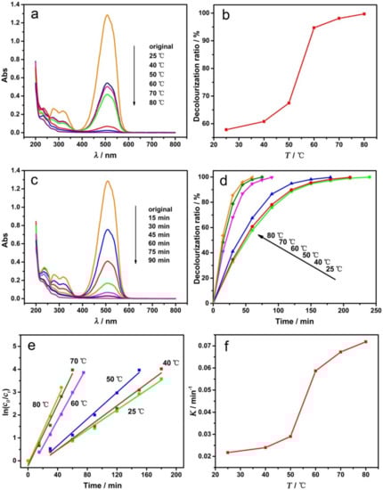 To further explore the effects of temperature on the decolorization reaction, the degradation experiments were carried out by changing the temperature and time. Figure 7c shows the UV–visible absorption spectra of MO at 60 °C for different decolorization times, and Figure 7d shows the curve of DR versus time at different temperatures. It can be seen that, with the prolongation of degradation time, the DR of MO gradually increased until it reached 100% (complete decolorization, the solution is colorless and transparent). When the degradation temperature was 25, 40, 50, 60, or 80 °C, the decolorization rate increased sequentially, and the time required for complete decolorization shortened to approximately 240, 210, 180, 90, 75 and 60 min, respectively.