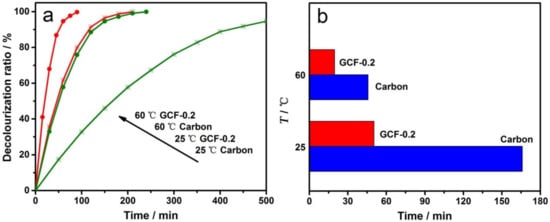 MO electrochemical degradation experiments were carried out at 25 and 60 °C with the carbon cathode and GCF-0.2 cathode, respectively. The decolorization ratio-time curves are shown in Figure 8a. As can be seen from the figure, when the temperature was raised to 60 °C, the reaction rate was significantly accelerated, regardless of using the carbon or GCF-0.2 cathode. Figure 8b reveals the decolorization times required for the carbon and GCF-0.2 cathodes when the DR of MO reached 50%. At the reaction temperatures of 25 and 60 °C, compared with the carbon cathode, the GCF-0.2 cathode increased the DR of MO by approximately 70.9% and 57.0%, i.e., the elevated temperature did not improve the performance of the GCF-0.2 cathode. As is well known, •OH is a strong oxidant, and the reaction temperature has little effect on its activity. The increasing temperature is more favorable to promoting the direct oxidation at the anode; thereby, the electro-Fenton-like effect of the GCF-0.2 cathode is relatively weakened at 60 °C.