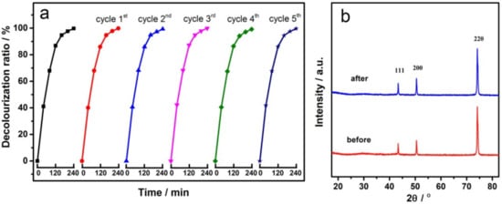 The stability and reusability of the electrode is very important for practical application. Therefore, the repeatability of the GCF-0.2 sample was tested at 25 °C to degrade MO, and the results are shown in Figure 9a. With the increase in the number of cycles, the performance of the electrode was similar. As can be seen from Figure 9b, the XRD patterns of the electrodes did not change significantly before and after cycling, and both of them only had the diffraction peaks of metal copper. All the above results indicate that the GCF-0.2 electrode has good repeatability and stability.
