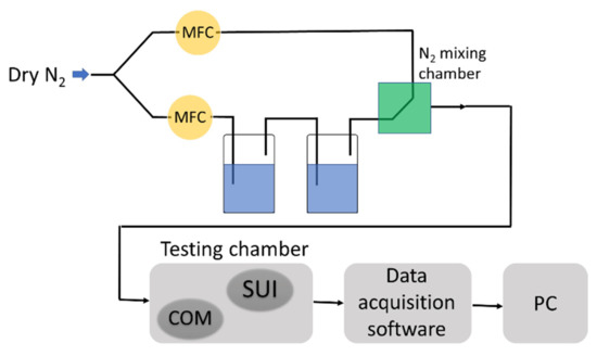 Experimental setup employed for RH measurements (MFC—mass flow controller, SUI –sensor under investigation, COM—commercial sensor).