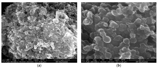 Scanning electron micrographs of the GO/CNHox/PVP at 1:1:1 w/w/w ratio: (a) ×50,000 magnification; (b) ×200,000 magnification.