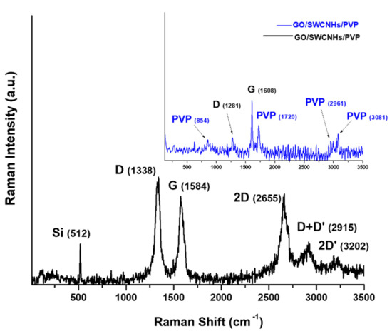 Figure 9 presents the recorded Raman spectra for the GO/CNHox/PVP 1/1/1 nanocomposite on silicon (black color), while the top inset represents the recorded Raman spectra from which the silicon response was subtracted.