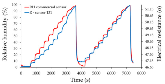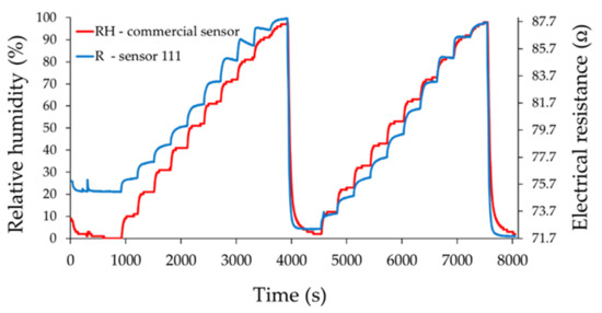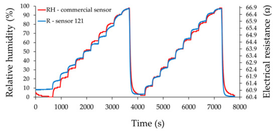 Test conditions for the proposed experimental setup were not always identical. We tried to make identical jumps of humidity in the testing room, but there were small differences as shown by the commercial sensor (reference sensor). This was the reason for using both sensors in the testing room, the commercial one, whose answer was accepted as a reference answer and the investigated sensor. The idea of the experimental setup was to be able to track the response of the investigated sensor with the reference sensor in order to find out if the sensor is suitable as a resistive humidity sensor.