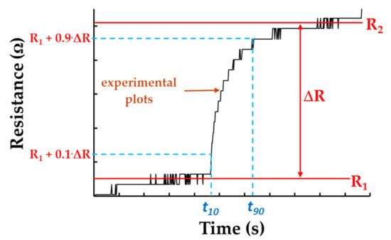 where and represent the moments in time where the response R(t) reaches 90% and 10%, respectively, from the total variation of the sensor’s resistance as a result of a change in the value of the RH [45]. Similarly, the recovery times were calculated (see the example in Figure 15).