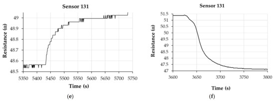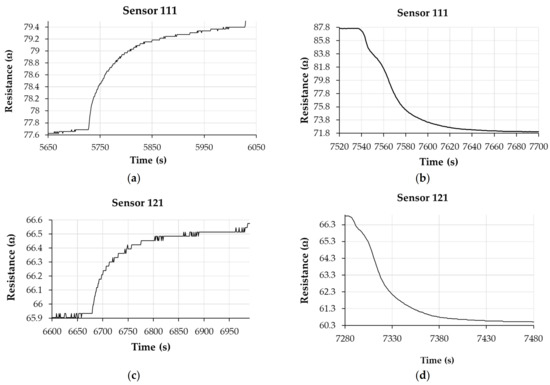 From Figure 10, Figure 11 and Figure 12, the drift of the sensor when returning to the “0” point of relative humidity is noticeable. The measured resistance of the sensing layer at 0% RH, between the measurement cycles, had approximately the same value when sensor 121 was used.