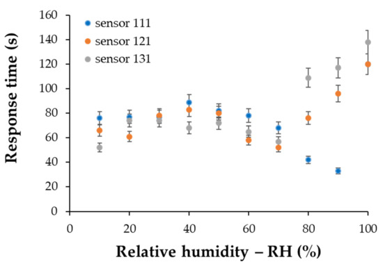 The values of response times for the commercial sensor were in the range of 40–90 s, the higher values being recorded for RH values of over 50%. Comparing the response of the investigated sensors, we observed that sensor 111 showed values of response times in the range 40–90 s, while sensors 121 and 131 had response times between 50–100 s and 50–110 s, respectively (Figure 17).
