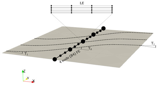 Therein, represents the vector containing the generalised displacements, is the expansion function depending on the cross-section coordinates, and M is the number of expansion terms. In this manuscript, two expansion functions are utilised, namely the Lagrange expansion (LE) and Hierarchical Legendre expansion (HLE). Such families are explained in upcoming sections. A graphical representation of the spatial discretisation of the macroscale structure is shown in Figure 1.