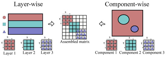 Based on this approach, and taking advantage of the CUF capacities, the LW modelling can be extended straightforwardly to any component on the cross-section with no loss of generalisation. Indeed, by extending the meaning of the index k from the layer to a generic component of the cross-section, one can generate independent kinematics for the matrix, the fibre or any other component and then impose the compatibility of displacements at the interfaces. Thus, the assembly of the stiffness matrix of a component-wise (CW) model remains formally the same as that of LW approaches. Both assembly procedures are illustrated in Figure 3.