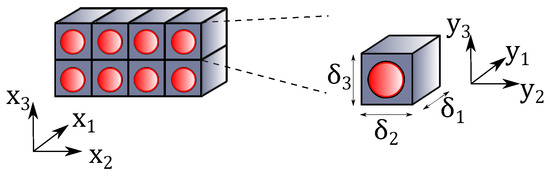 where V is the volume of the RUC, is the local field, dependent of the global and local coordinates ( and , respectively) and is the averaged field which only depends on the global coordinates. Generally, periodic boundary conditions are applied to guarantee the compatibility of deformations with respect to the adjacent RUCs. This periodicity can be written as: