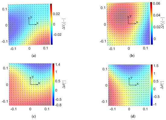 (a) Fibre volume fraction () random field over a . (b) random field over a ply. (c) Misalignment field over a ply. (d) Misalignment field over a ply. These random fields are generated by means of the Karhunen-Loève expansion. The stochastic fields represent the fibre volume fraction and has a mean value and a standard deviation and fibre misalignments of null mean and standard deviation .
