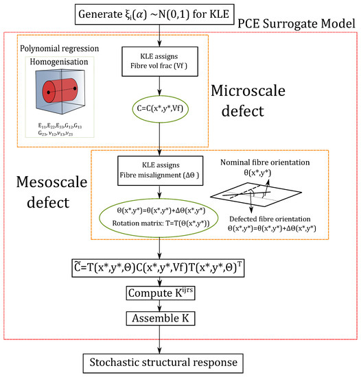 The flow-chart of this multiscale procedure is depicted in Figure 8 and is explained herein. First of all, terms for the KLE are generated by means of Latin Hypercube Sampling (LHS) for each analysis run. The reason for generating is that the structure that is analysed has four layers and n terms for defects are considered in the KLE of each ply’s stochastic fields. Once the structural analysis begins, a fibre volume fraction and fibre misalignment field are obtained with the KLE and are assigned to each integration point. First, an homogenisation of the material properties is carried out by means of a polynomial regression, whose curves are shown in Figure 9. Then, these material properties are used to calculate the coefficients of the material stiffness matrix (C), which is then rotated into the structural reference frame taking into account the fibre misalignment to obtain . Afterwards, the FN is computed for each FE, and the global stiffness matrix is assembled. Once the equilibrium state is calculated, the internal stress state is employed to calculate the geometrical stiffness matrix from Equation (13). Finally, the stochastic buckling response is retrieved.