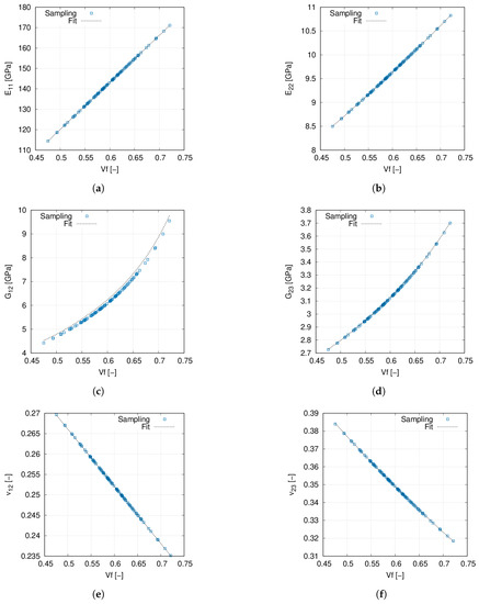 (a) vs. , (b) vs. , (c) vs. , (d) vs. , (e) vs. , (f) vs. . Sampling results and data fit of the homogenised material properties. Fibre volume fraction is treated as a Gaussian random variable with mean value and standard deviation .