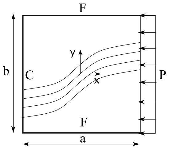 This section presents a series of numerical assessments on the verification of the proposed in-house-developed 1D CUF-based FE models used to solve the linearised buckling problem of VSC plates. In these assessments, a four-layer balanced and symmetric variable stiffness composite plate is analysed. The structure is clamped on one edge, while, on the opposite side, a pressure kPa is applied, and the remaining edges are free (see Figure 10), which is equivalent to apply a unitary point-load. The plate dimensions are listed in Table 1 and the material properties of the fibre and matrix are shown in Table 2, along with the homogenised material properties using a nominal fibre volume fraction . Recall that these homogenised material properties are the outcome of a micromechanical analysis, in which the RUC is composed of a two-node beam FE and a fourth-order HLE using BFM for the cross-section. Two fibre orientations are considered in this study, namely:
