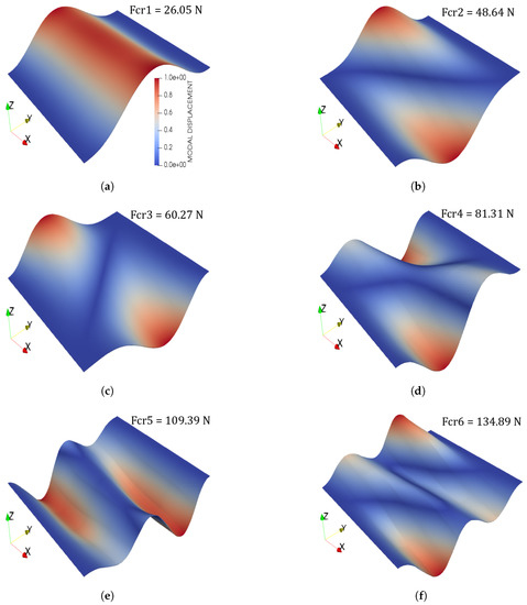 Some differences between Case 1 and Case 2 buckling loads arise and are commented herein. The clearest one is that Case 1 provides a larger critical load than Case 2. Indeed, it is one order of magnitude larger. This is due clearly to the fibre orientation and, particularly, to the rotation angle . That is, in Case 2, the fibre path is rotated 90 degrees with respect to the x-axis, which coincides with the loading direction. Thus, the load-carrying capacity of the plate diminishes. Further details regarding the stiffness and buckling load behaviour of symmetric and balanced VSCs can be found in the paper by Gürdal and Olmedo [52]. The buckling modes of the structure of both fibre angle orientations also present differences and are gathered in Figure 11 and Figure 12. It is appreciated that, for both cases, the first mode corresponds to a single-wave bending mode in the direction of the applied load. Then, the second mode presents a double-wave in the transverse in-plane direction and a single longitudinal undulation for both fibre paths. The third mode shows a triple undulation in the transverse in-plane direction in Case 1 (see Figure 11c), whereas a double one appears for Case 2 (see Figure 12c). More evident differences appear when higher modes are considered.