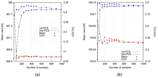 - The mean value provided by the considered PCE converges when some 200 to 300 samples are employed to construct such surrogates. Conversely, COV needs additional samples.
