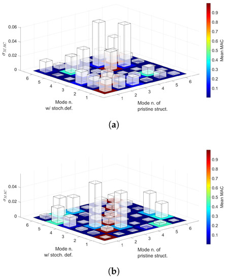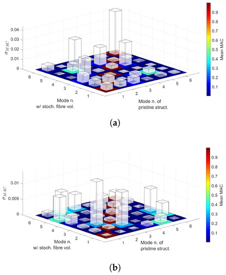 Correlation indices reported in Table 9 have a value close to one. This indicates that when one of the confronted buckling loads increases, so does the other (e.g., and in ). This means that the spatial variation of fibre volume fraction affects the buckling loads in the same manner, that is, increasing or decreasing all of them. Then, concerning the mode variability, 3D MAC matrices in Figure 16 show mean values close to one in the main diagonal. Therefore, no mode switching occurs. However, out-of-the-diagonal components show non-zero values. For instance, in Figure 16a values close to 0.4 are appreciated in components MAC and MAC, while in Figure 16b this occurs for MAC, MAC, MAC, MAC and their transposed. This implies that the defective buckling modes show resemblances between the cited modes.