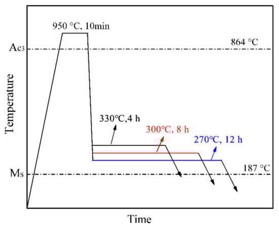 The conventional austempering experiments were conducted using DIL 805A, as shown in Figure 1. The conventional austempering consisted of austenitization at 950 °C for 10 min, followed by cooling to 330, 300 and 270 °C, and the corresponding hold for 4, 8 and 12 h, hereinafter referred to as CA-330, CA-300 and CA-270.