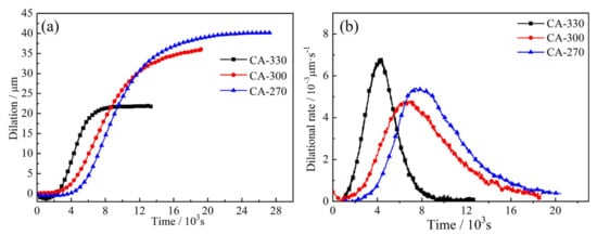 Figure 2 shows the dilation curves and dilatational rate curves of samples under the CA process. The straightness in the early stages and the end stages of the dilation curves indicates that the sample’s bainite transformation is in the incubation period and the completion stage. Data on thermal expansion of CA-330 and CA-270 are described in the literature [16,17]. The incubation period time and complete transition time of bainite are 1364 and 19,080 s for CA-270. As the temperature increases, the time required for both incubation and complete transformation becomes shorter. The relevant transition times and transition rates are listed in the Table 1.