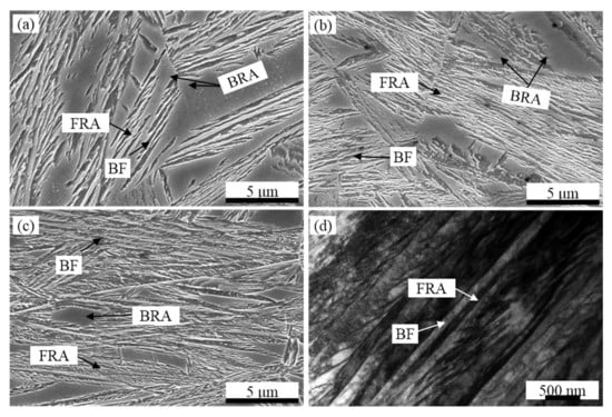 SEM (a–c) and TEM (d) microstructures of specimens austempered at various temperatures. FRA is film retained austenite; BRA is blocky retained austenite; BF is bainitic ferrite. (a) CA-330, (b) CA-300, (c,d) CA-270.