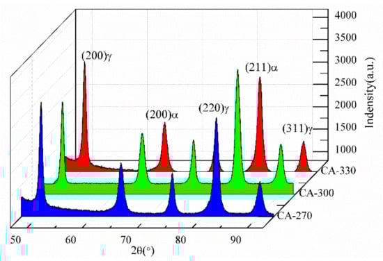 The XRD patterns of the experimental steel at different temperatures are shown in Figure 4. The structure comprises BCC (BF) and FCC (RA) at different temperatures, and no carbides are generated. The content of RA in CA-330, CA-300 and CA-270 samples is 32.5%, 28.6% and 24.8%, respectively.