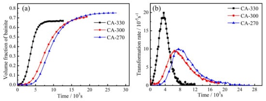 (a) Volume fraction of bainite, (b) transformation rate as a function of isothermal holding time at CA process.