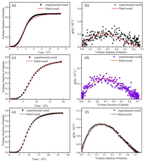 The calculated values and experimental values of CA-330 sample, CA-300 sample and CA-270 sample. (a,c,e) volume fraction of bainite as a function of isothermal holding time; (b,d,f) transformation rate as a function of volume fraction of bainite.