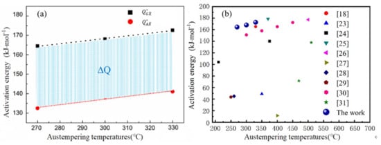 As shown in Figure 7a, the model’s value of and ΔQ* at different austempering temperatures are fitted. The value of at different isothermal temperatures is also calculated. The and show a linear decline trend with the austempering temperature. The results are the same as those reported in the literature [22,26], which indicates that the fitting results in this paper are credible. It should be noted that the activation energy is not divided into grain boundary activation energy and autocatalytic activation energy, except in the literature [22,27]. In Figure 7a, the blue area between the black dotted line and the red dotted line represents the difference between the initial grain boundary activation energy and the autocatalytic activation energy, ranging from 30 to 32 kJ/mol. Figure 7b describes bainite’s activation energy of different experimental steels, which ranges from 11 to 180 kJ/mol [22,27,28,29,30,31,32,33,34,35]. The activation energy of bainite isothermal transformation is all within the range, which indicates that the fitting results are reliable.