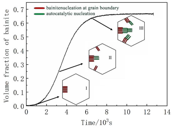 The schematic diagram of bainite nucleation and growth under the CA process can be summarized, as shown in Figure 8. At the initial stage of bainite transformation (stage Ι), the bainite transformation amount is very small. The microstructure interfaces are mainly austenite/austenite interfaces, bainite nucleation at the grain boundary. The number of bainite ferrite/austenite interfaces increases with the increase in bainite content. Bainite can nucleate at the newly formed bainite ferrite/austenite interface. At this stage (stage ΙΙ), bainite nucleates at the austenite/austenite interface and the ferrite/austenite interface. As the bainite transformation enters the later stage (stage ΙΙΙ), the prior austenite grain boundary’s nucleation position is exhausted, and the available volume fraction of austenite decreases, the nucleation rate of bainite decreases. It is mainly dominated by the bainite ferrite/austenite interface, namely autocatalysis nucleation.