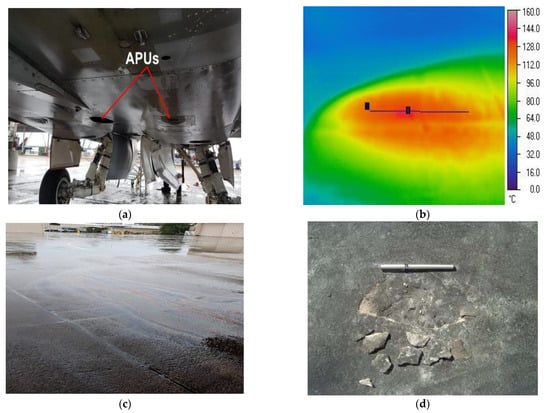 (a) APU of a F/A-18 Hornet aircraft, (b) thermal profile of military airfield pavement exposed to APU exhaust, (c) oil leak after single maintenance, and (d) spalling of the parking apron.