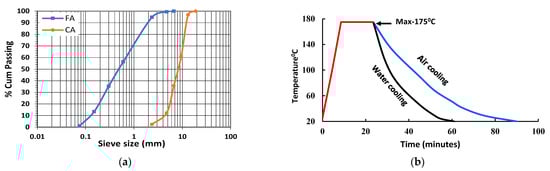 (a) Gradation curves of aggregates, (b) heating and cooling cycles of specimens.