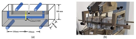 Beam samples were assessed for flexural strength, according to AS 1012.11. Control’s (manufacturer) flexural testing machine of 150 KN capacity with a deflection rate of 0.3 mm/min was used to measure the concrete beams’ flexural strength. Figure 4a,b represents the test setup and the actual specimen test. Two transducers were attached with brackets to the beam specimen to measure the mid-span deflection, taken as the two readings’ average. Two metallic cylinders positioned at 100 mm from the supports (1/3 distance of the span) were used to apply the load equally. Two identical metallic cylinders spaced at 300 mm were used to support the specimen.