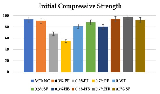 Various factors govern the behaviour of samples exposed to higher temperature and HC fluids. Figure 5 shows the initial compressive strength for different fibre-reinforced concrete. Figure 6 shows the residual compressive strength and % loss of compressive strength of samples exposed to high temperature only and the combined effect of high temperature and HC fluids. For repeated exposure up to 175 °C only, loss of significant compressive strength was recorded, as seen in Figure 6a,b. After subjecting specimens to a recurring high temperature for 60 cycles, the control specimens lost 32.65% of their initial compressive strength. For 0.3% SF and 0.5% SF reinforced specimens, compressive strength loss was 26.50% and 31.06%, respectively. For PF reinforced concrete, the loss was more significant. For 0.3%, 0.5% and 0.7% PF reinforced concrete, the compressive strength loss was 26.15%, 42.65% and 44.24%, respectively. The addition of extra PF would create more porosity inside the concrete matrix after melting, resulting in more deterioration of its residual properties. Whereas for SF, no melting of SF occurs at 175 °C, thus no extra porosity is created that reduces concrete strength significantly. Similarly, for HB specimens with 0.3%, 0.5% and 0.7% HB fibre reinforcement, the compressive strength loss was 27.42%, 25.40% and 22.05%, respectively.