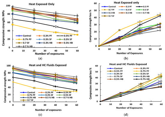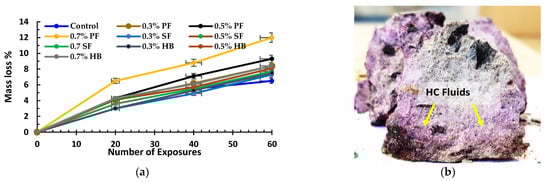 The mass loss of specimens after recurring exposure to high temperature and HC fluids is shown in Figure 7a. The specimens lost their initial free water entirely due to recurrent high temperature within the first few cycles. Within the first twenty cycles of heating, the mass loss rate was higher due to the evaporation of initial free water, which escaped outside in a vapour state. After 20 cycles of HC fluids and high-temperature exposures, the mass loss slope decreases gradually, which implies that the concrete matrix lost its initial free water within the initial cycles. However, the maximum fibre Vf = 0.7% used in this study was low enough to cause any significant mass loss due to fibres’ presence. Specimens containing 0.7% PF fibres and 0.7% SF suffered a mass loss of 12% and 7.7%, respectively. At the same time, HB samples lost 8.4% of the mass after 60 cycles. However, Lee et al. [32] suggested that below 200 °C, loss of cementitious component is negligible. Nevertheless, a few other studies [40,41] also strongly support that when concrete is subjected to chemical and high temperature, the mass loss could be due to the decomposition of mineral compounds in concrete besides the loss of initial water.