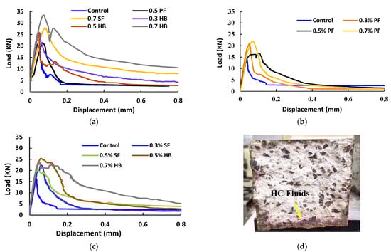 Typical load vs. displacement curve (combined exposures). (a) Samples after E60, (b) PF samples after E60, (c) SF and HB FRC after E60, (d) HC fluid penetration into beam after E60.