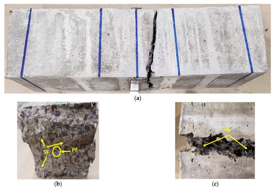 However, PF FRC samples were split entirely into two parts since fibres were melted after repeated heating as also reported in SEM results, thus behaving like ordinary concrete. The SF has been seen protruding from the concrete matrix after the specimen has ruptured, as seen in Figure 9b,c; the PF, once it reached its maximum tensile strength, also ruptured. Pliya et al. [42] and Çavdar et al. [43] also found that SF and HB fibres provide more flexural strength than single PF fibre-reinforced concrete.