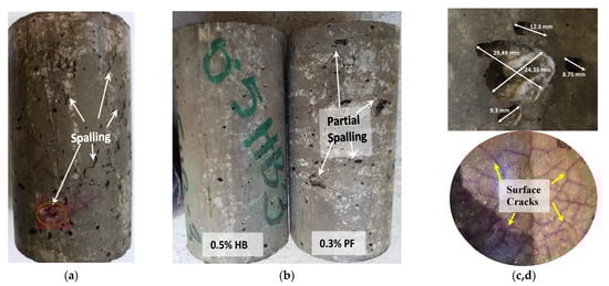 Spalling of concrete has a significant influence on concrete fire performance and can be a governing factor in determining the fire resistance of an RC structural member [43]. Some researchers [18] reported spalling in high-strength concrete once subjected to high temperatures. Similarly, ordinary concrete specimens exposed to recurring 60 cycles of high temperature and HC fluids suffered significant spalling, as seen in Figure 10. Though samples were exposed to 175 °C, the combined effect of chemical degradation due to aviation oils and repeated heating may have caused the spalling. PF samples also suffered partial spalling (Figure 10b) once exposed to high temperatures and HC fluids. However, no significant spalling in HB FRC samples. The main reason for spalling in the high strength concrete is its dense microstructure, which prevents moisture from escaping when exposed to high temperatures. In this study, the lack of spalling phenomenon in the hybrid fibre-reinforced samples’ might be due to the melting of PF fibres, thus creating a microchannel, which helps release vapour pressure, and the SF prevents the spalling by stopping micro-crack propagation.
