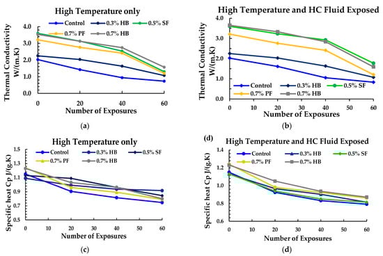 A similar separate test was done to measure the value of specific heat Cp. The specific heat measured for specimens exposed to high temperature only and high temperature and HC fluids is plotted in Figure 12c,d against the number of exposures. The specific heat of PF, SF and HB FRC ranges from 1.03 to 1.4 compared to 1.15 of the control specimen. Kodur et al. [46] also reported lower specific heat values in ordinary concrete than the HSC. With the increase in the number of heat exposures, a significant decrease in the specific heat was recorded. SF and hybrid FRC show slightly higher specific heat values, which may be attributed to steel fibres. The use of PF fibres reduces the specific heat in comparison to other fibres.
