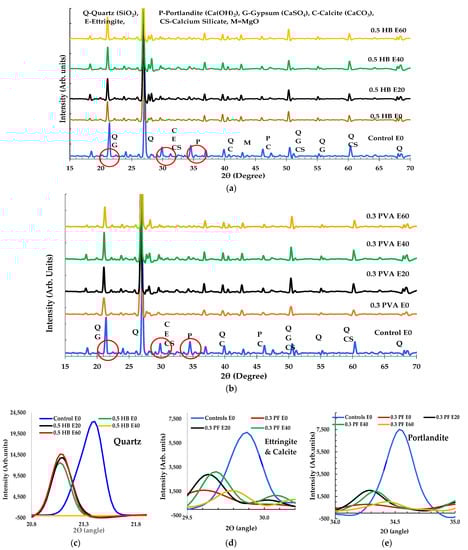 XRD of samples exposed to repeated heat and HC fluids (a) 0.5% HB FRC, (b) 0.3% PF FRC, zoom on the crystallographic modifications- (c) Quartz, (d) ettringite and calcium silicate and (e) portlandite.
