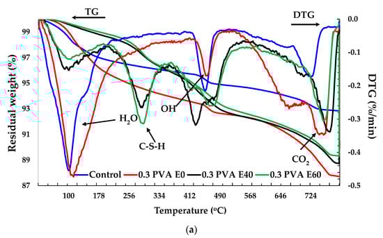 The thermogravimetric (TG) tests were conducted for control and FRC specimens after HC fluid and high-temperature exposure, as shown in Figure 14. The TG curve of the original concrete showed three rapid weight loss sections. The picks between 20 to 200 °C represent weight losses due to the escape of parts of the bound water and free water, though Song et al and Fares et al. [51,52] suggested that the free water was eliminated at 120 °C. Then, at 182 °C, gypsum decomposed along with ettringite [45] and carboaluminate hydrates, causing mass loss. This sharp mass loss in the 30–200 °C temperature range was evaluated to be about 3.19%, 3.34%, 1.36% and 1.15%, respectively, for Control E0, 0.3% PF E0, E40 and E60. Repeated exposure to HC fluid and high-temperature cycles caused the reduction in mass loss because after initial exposure, excess and bound water almost dries up. Similarly, with the increase in the number of exposures, the mass loss percentage in higher temperature ranges increased significantly, as seen in Table 5.